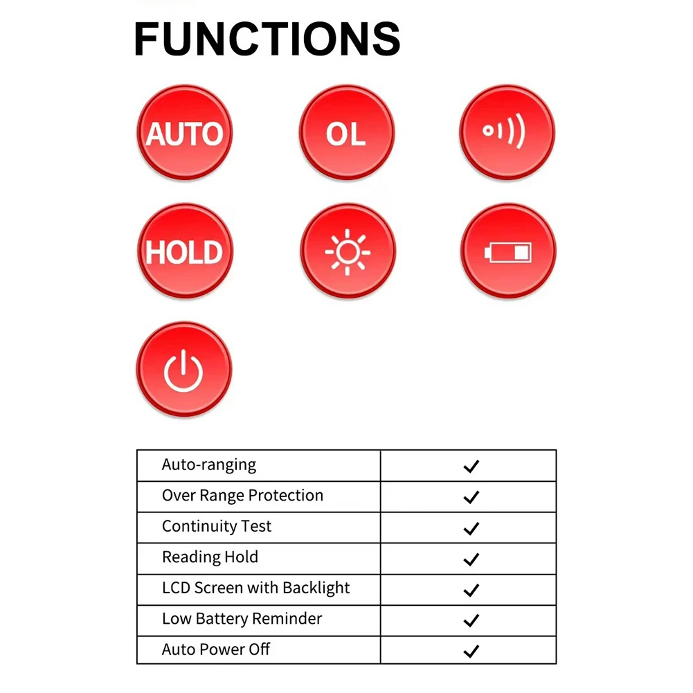 1. Handheld Auto-Ranging Multimeter: Lightweight design, range recognition, and supports AC voltage, current, resistance, and capacitance measurements.